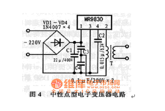 圖3和圖4是兩種不同接法的電子變壓器電路,其原理都是將MR9830的2腳輸出的高頻電壓由鐵氧體變壓器T降壓和隔離后輸出。其中,圖3是將MR9830的2腳輸出由C3隔離后得到電源負端形成回路。圖4則是利用C3、C4制造一個人為的“中性點”,而讓MR9830的2腳輸出的高頻電壓經T的初級繞組到此“中性點”形成回路。經實際測試發現:圖3輸出的電壓