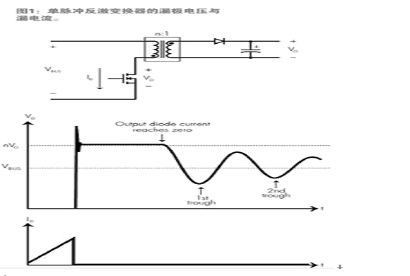 圖1說明了在非連續導通模式下工作的電流模式反激變換器的漏極波形,這里只施加了一個門脈沖。在第一個時間間隔,漏電流上升,直到達到所需的電流強度,此時電源開關關閉,回轉變壓器中的漏電感與節點電容形成諧振。這會導致漏電感浪涌,該浪涌受箝位電路限制,在電感浪涌消失后,漏極電壓返回到等于輸入電壓加上初級線圈感應電壓的水平。如果忽略初級線圈電感和節點電容的影響,當輸出二極管中的電流降到零時,漏極電壓立即降到總線電壓,但漏極電壓衰減到如圖1所示的水平。