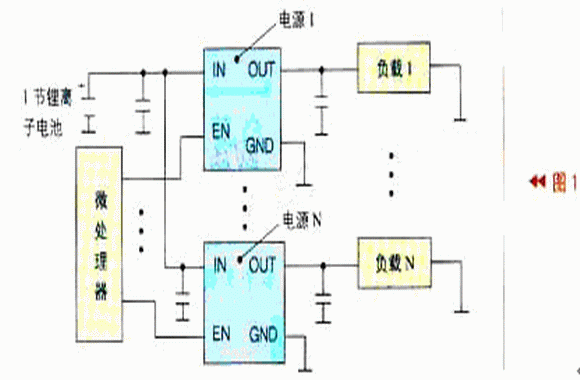 微處理器通過控制電源的工作來實現負載管理,如圖1所示,圖1中有N個電源,每個電源帶一個負載(有N個負載)。每一個電源都有一個使能端(EN,高電平有效)或關閉電源控制端(SHDN,低電平有效),微處理器的I/O口與電源的EN端或SHDN端連接,輸出邏輯電平來控制電源的開通或關斷,這樣就可以實現負載管理。例如,某產品有6個電源,在某種工作狀態時,需要電源1~3開通,則負載1~3得電工作,電源4~6關斷,負載4~6失電不工作,只要在電源1~3的EN端加邏輯高電平,在電源4~6的EN端加低電平即可。