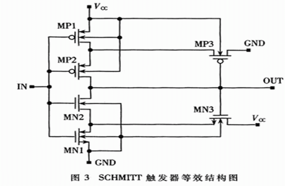 改進的電路如圖2所示,電路結構由采樣、先導控制、比較器、遲滯反饋回路、加速響應電路、緩沖器六部分構成。電阻R1、R2、R3、R4構成分壓電阻網絡實現對Vcc的采樣;MNl、R5、INVl組成先導控制電路,實現對比較器灌電流的控制;MN2、R6、MP2組成比較器,實現采樣電壓與MN2的VTH比較;MP1構成正反饋回路,可實現Vcc的遲滯功能;INV2、MP3、R7構成正反饋回路,可加速比較器的翻轉,從而提高電路的響應速度;SCHMITT觸發器和INV3是緩沖電路,對比較器的輸出波形進行緩沖和整形,SCHMITT觸發器的結構如圖3所示,其工作原理詳見參考文獻[3];另外,電容C1起濾波和儲能作用。