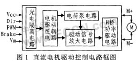 直流電機驅動控制電路分為光電隔離電路、電機驅動邏輯電路、驅動信號放大電路、電荷泵電路、H橋功率驅動電路等四部分,其電路框圖如圖1所示。