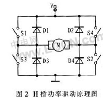 直流電機驅動使用最廣泛的就是H型全橋式電路,這種驅動電路方便地實現直流電機的四象限運行,分別對應正轉、正轉制動、反轉、反轉制動。H橋功率驅動原理圖如圖2所示。