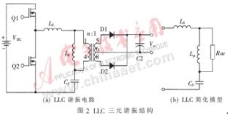 在二元件諧振網(wǎng)絡(luò)的基礎(chǔ)上,根據(jù)不同的應(yīng)用可構(gòu)建不同種類的三元件的諧振網(wǎng)絡(luò)。三元件諧振網(wǎng)絡(luò)與二元件諧振網(wǎng)絡(luò)相比有很多優(yōu)點(diǎn),比如在全負(fù)載范圍內(nèi)都具有較高的轉(zhuǎn)換效率,而且頻率變化范圍比較窄等。本文主要介紹和分析由三元件LLC構(gòu)成的諧振網(wǎng)絡(luò),其結(jié)構(gòu)如圖2(a)所示。