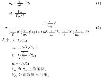 串聯(lián)電感Ls、并聯(lián)電感Lp和諧振電容Cs組成LLC諧振網(wǎng)絡(luò),在此必須注意到負(fù)載也參與了諧振。對(duì)其進(jìn)行建模,LLC簡(jiǎn)化模型如圖2(b)所示,Ra c為副邊的負(fù)載折算到原邊的等效負(fù)載,折算公式見式(1)。因?yàn)樵呡斎腚妷簽榉讲?,電流為近似正弦波,而變壓器輸出電壓也是方波,電流也是正弦波,因此可以推?dǎo)出其電壓傳遞函數(shù),如式(2)所示。