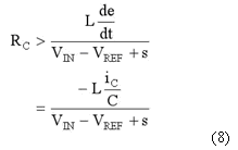 其中,iC是輸出電容器的電流,它在0A的穩(wěn)態(tài)點周圍產生紋波。將2ICMAX定為紋波電流iC的峰到峰的最高值。那當s>0時,要獲得ds/dt<0的足夠條件為: