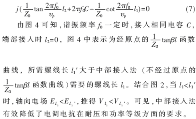 由圖2可知,軸向電場(chǎng)能量以sin2βz形式分布,開路端電場(chǎng)能量最為集中。端部加載時(shí),加載電抗將不得不承受高電壓。例如,Qu=6000、30MHz、3dB帶寬為50kHz的螺旋濾波器,在RL=50Ω,傳輸功率45kW時(shí),螺線端部電壓將達(dá)75kV。這給電調(diào)器件提出了相當(dāng)高甚至難以達(dá)到的耐壓要求。
