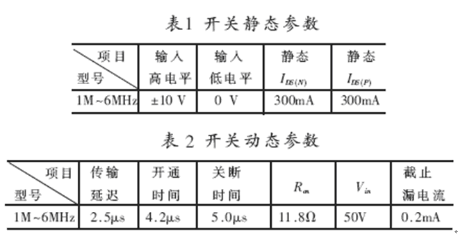 表1、2給出了開關(guān)的實(shí)測(cè)指標(biāo)。圖8給出了開關(guān)瞬時(shí)通斷仿真曲線。