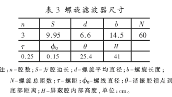 調(diào)頻范圍1.5M~3MHz;通帶中心插耗A0≤3dB;25dB帶寬△f25dB≥25kHz; 終端負(fù)載RS=RL=50Ω;傳輸功率P=100W。采用等元型螺旋濾波器設(shè)計(jì)法[6]確定的方腔螺旋腔濾波器腔數(shù)及尺寸見表3,測(cè)試結(jié)果見圖9、10及表4。