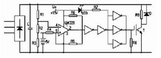 設UDC為電力電容C1 兩端的電壓,電壓比較電路直接檢測該電壓,與被測值超過設定允許值時,電壓比較器反轉, 觸發制動單元VB 導通,電力電容上的電荷經R 釋放,使電壓降低,反之,當該電壓低于設定允許值時,電壓比較器翻轉回原先狀態,輸出端為高電壓,經邏輯轉換后關斷UB 。由于比較器為OC 門輸出,該端電壓近乎電源電壓UC。