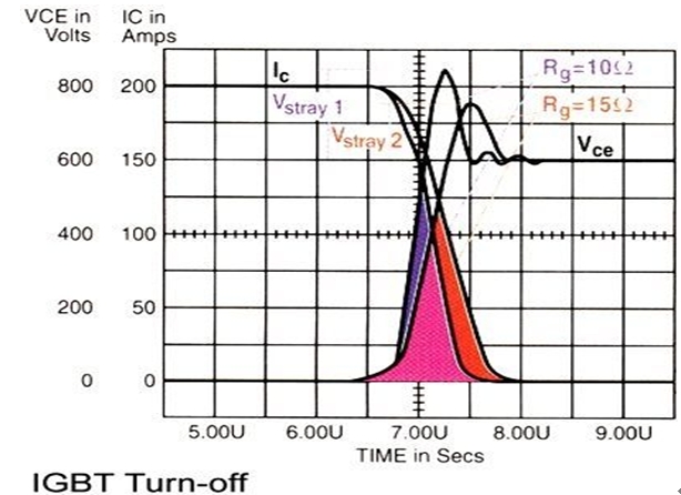每個IGBT開關特性的設定可受外部電阻RG的影響。由于IGBT的輸入電容在開關期間是變化的,必須被充放電,柵極電阻通過限制導通和關斷期間柵極電流(IG)脈沖的幅值來決定充放電多長時間(見圖1)。由于柵極峰值電流的增加,導通和關斷的時間將會縮短且開關損耗也將會減少。減小RG(on)和RG(off)的阻值會增大柵極峰值電流。當減小柵極電阻的阻值時,需要考慮的是當大電流被過快地切換時所產生的電流隨時間變化特性di/dt。電路中存在雜散電感在IGBT上產生大的電壓尖峰。這一效果可在圖2所示的IGBT關斷時波形圖中觀察到。圖中的陰影部分顯示了關斷損耗的相對值。集電極-發射極電壓上的瞬間電壓尖峰可能會損壞IGBT,特別是在短路關斷操作的情況下,因為di/dt比較大??赏ㄟ^增加柵極電阻的值來減小Vstray。因此,消除了由于過電壓而帶來的IGBT被損毀的風險??焖俚膶ê完P斷會分別帶來較高的dv/dt和di/dt,因此會產生更多的電磁干擾(EMI),從而可能導致電路故障。表1顯示不同的柵極電阻值對di/dt的影響。