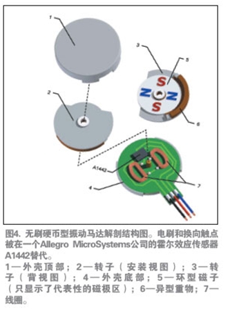 如前所述,無刷電機具有較長的壽命,并由于產生的電火花較少,也沒有了RFI干擾。無刷直流(BLDC)設計還提供業內直徑最小、厚度最薄的扁平振動馬達。圖4介紹了這種馬達的基本構造。