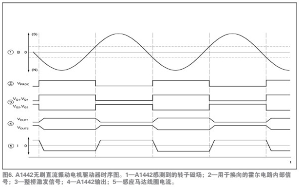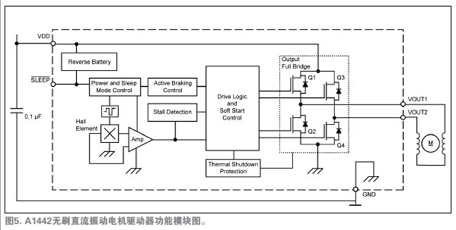 A1442是驅動馬達唯一必須的的IC。圖5所示的功能模塊圖說明了設備運行和先進的特性。注意圖4和圖5中,采用集成的霍爾傳感器免除了外部霍爾傳感器,從而減少了馬達PCB元件數量。唯一所需的外部元件是一種標準電路特性——位于應用馬達安裝PCB上的0.1µF的旁路電容,它用于降低在開關電源的電感負載時產生的瞬時電壓峰值。