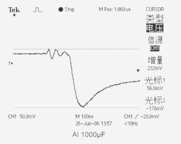 1、當(dāng)測試電容為(AL)液體鋁電解電容器CT=1000μF ESR=56mΩ時(shí),輸出電壓下跌值為232mV。