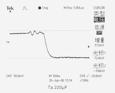 2、Ta固體片式鉭電解電容器,其中470μF雖然容量較大,ESR值卻較高(149 mΩ)而效果還不如220μF(73mΩ)的好。因此,由于ESR值較高,電容的陰極材料MnO2的電導(dǎo)率較低(0.1S/cm),其高頻特性不好而使得應(yīng)用效果不理想,電源電壓變化值達(dá)到了292mV和172mV。