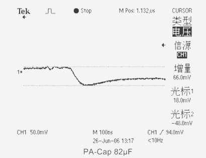 5、當(dāng)測試電容采用(PA-Cap)聚合物片式疊層鋁電解電容器CT=82μF ESR=13mΩ時(shí),輸出電壓下跌值僅為66mV。