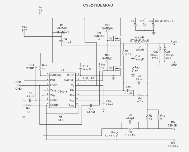 根據(jù)DC/DC變換器生產(chǎn)商提供的評(píng)估板資料和典型應(yīng)用電路,PA-Cap作為濾波電容在DC/DC變換器CS5211DEMO/D評(píng)估板線路中的應(yīng)用,實(shí)驗(yàn)的線路原理圖如圖2。
