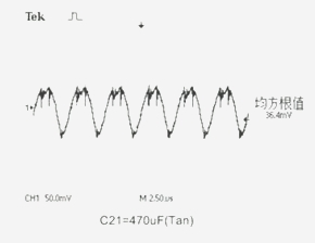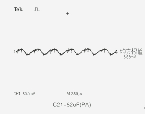 電路中電壓輸入端C6.7.8接入PA-Cap 6.3V/22μF。在輸出端C20.21位置分別接上鉭電解電容器:10V/470μF、16V/220μF和PA-Cap聚合物電容器:10V/22μF、4V/82μF作為濾波電容器,用示波器測(cè)量電路的輸出紋波電壓Vr。