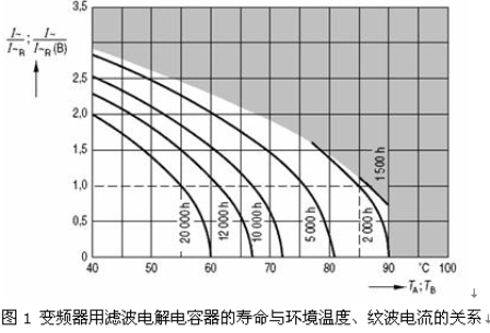 圖1為變頻器用濾波電解電容器的壽命與環境溫度、紋波電流的關系(日立電解電容器的數據表中沒有給出這樣的曲線)。
