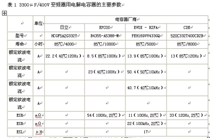 作為變頻器/逆變器的整流濾波電容器,其最主要的參數是額定電壓、電容量,通常采用電解電容器作為整流濾波電容器。但是電解電容器最大的缺點就是使用壽命問題,特別是在高溫條件下尤為明顯,電解電容器的壽命直接影響著變頻器/逆變器的使用壽命。在實際應用中因為過大的紋波電流在濾波用電解電容器的ESR產生熱而是濾波用電解電容器的壽命大大減少,通常這個紋波電流確實無法見效的。