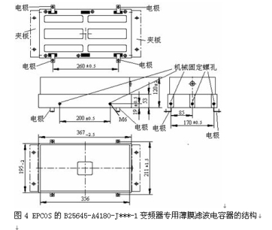 以EPCOS的B25645-A4180-J***-1變頻器專用薄膜濾波電容器的結構為例,如圖4。電容器的引出端為銅板,裝配方式可以是將電極用螺栓固定在直流母線板的正、負極,實現電氣連接,這樣的電氣連接電容器與直流母線所包圍的空間將非常小,因而所產生的寄生電感也將非常小。再用L型固定夾板將電容器模塊固定在散熱器上,完成電容器模塊的機械固定,如圖3的安裝方式 。