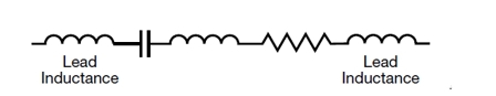 引腳電容相對于表面貼裝電容器,除了增加了引腳之外,其他并沒有什么不同。其等效模型與MLCC模型一樣,除了增加了引腳所產生的電感之外,見圖5。