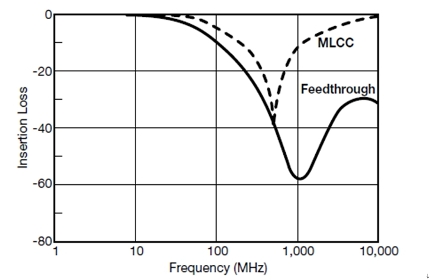 對于寄生參數來說,這種幾何結構具有幾個有趣的問題。首先,電容器的寄生電感要比具有等效電容的相當尺寸的片式電容器要小得多。可以測量穿心電容的寄生電感,大約為250pH。該相同的現象是在降低了電感的同時也降低了ESR(通道長度,通道長度,通道長度!)最后,穿通部分中電感的引入將增加衰減帶寬。圖8給出了一只100pF的穿心電容和一個等效的標準片式電容之間的插入損耗比較。