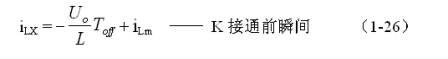 反轉式串聯開關電源輸出電壓一般為負脈沖的幅值。當開關電源工作于臨界連續電流狀態時,流過儲能電感的初始電流i(0)等于0(參看圖1-8-a)),即:(1-26)式中流過儲能電感電流的最小值iLX等于0。因此,由(1-21)和(1-26)式,可求得反轉式串聯開關電源輸出電壓Uo為: