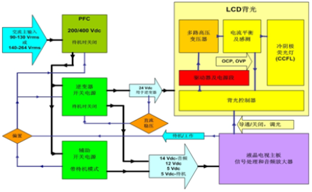 傳統(tǒng)液晶電視電源主要由交流-直流(AC-DC)轉(zhuǎn)換、直流-直流(DC-DC)轉(zhuǎn)換及高壓逆變器幾部分組成。AC-DC和DC-DC在同一塊電路板上,逆變器在另一塊電路板上,通常與液晶面板在一起。其中,AC-DC電源部分將市電110 Vac/220 Vac電壓進行整流、PFC和濾波,再轉(zhuǎn)換為200 V/400 V的直流高壓。由于傳統(tǒng)逆變器的輸入電壓要求為24 V,所以200 V/400 V 的PFC的輸出電壓要經(jīng)過降壓轉(zhuǎn)換,以產(chǎn)生多路輸出電壓,其中一路24 V電壓提供給逆變器,即再經(jīng)過直流-交流(DC-AC)轉(zhuǎn)換為超過1,000 V甚至達2,000 V的高壓,以便驅(qū)動液晶面板的CCFL背光燈。這種標準24 V逆變器液晶電視開關(guān)電源的功能框圖如圖1所示。