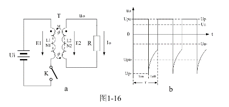圖1-16-a是單激式變壓器開關(guān)電源的最簡單工作原理圖。圖1-16-a中,Ui是開關(guān)電源的輸入電壓,T是開關(guān)變壓器,K是控制開關(guān),R是負載電阻。