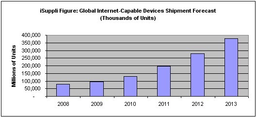 下圖為iSuppli對互聯網設備2008年至2013年期間全球出貨量的預測。