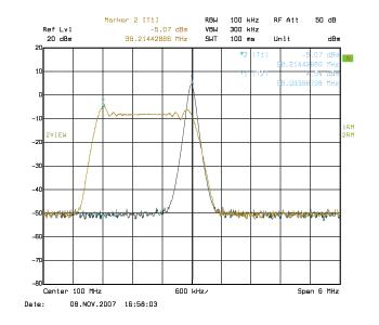 另一種可行解決方案是使用展頻振蕩器(Spread Spectrum Oscillator),來降低系統(tǒng)輻射出來的EMI電磁輻射干擾。圖4則顯示一個(gè)單頻信號(hào)的頻譜圖以及對(duì)該信號(hào)展頻后的頻譜圖。從圖中可知展頻后的頻率信號(hào)如何降低原來在接近100MHz的峰值。