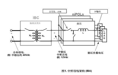 IBA的理念是把母線電壓降至一個稍稍高于負載點的電壓,再由較便宜的降壓器(niPoL)來完成余下的工作。降壓器(niPoL)經(jīng)由電感器傳輸電壓到負載,這電壓相等于上開關和下開關共同端電壓的平均值,等如上開關電壓占空比與中轉(zhuǎn)母線的乘積。