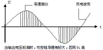 也就是交流220V市電經(jīng)可控硅控制后只有一部分加在主變壓器的初級。當(dāng)輸出電壓Uo較高時,可控硅導(dǎo)通角較大,大部分市電電壓被可控硅“放過來了”(如上圖所示),因而加在變壓器初級的電壓,即Ui較高,這當(dāng)然經(jīng)整流濾波后輸出電壓也就比較高了。