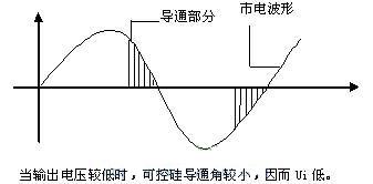 而當(dāng)輸出電壓Uo很低時,可控硅導(dǎo)通角很小,絕大部分市電電壓被可控硅“卡斷了”(如下圖所示),只讓很低的電壓加在變壓器初級,即Ui很低,這當(dāng)然經(jīng)整流濾波后輸出電壓也就很低了。