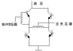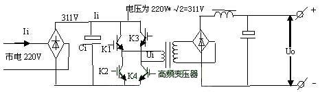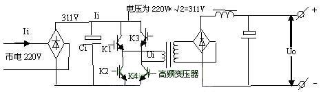 由電路可以看出,市電經(jīng)整流濾波后變?yōu)?11V高壓,經(jīng)K1~K4功率開關(guān)管有序工作后,變?yōu)槊}沖信號加至高頻變壓器的初級,脈沖的高度始終為311V。當(dāng)K1,K4開通時,311V高壓電流經(jīng)K1正向流入主變壓器初級,經(jīng)K4流出,在變壓器初級形成一個正向脈沖。