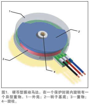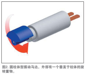 多數(shù)振動馬達(dá)由一個較小的電動馬達(dá)驅(qū)動一個偏心配重,如圖1所示。馬達(dá)為直流有刷或無刷電機,有兩種基本的結(jié)構(gòu):硬幣狀(扁平)與圓柱形(條狀)。