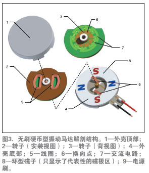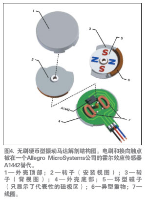 如前所述,無刷電機具有較長的壽命,并由于產(chǎn)生的電火花較少,也沒有了RFI干擾。無刷直流(BLDC)設(shè)計還提供業(yè)內(nèi)直徑最小、厚度最薄的扁平振動馬達(dá)。圖4介紹了這種馬達(dá)的基本構(gòu)造。
