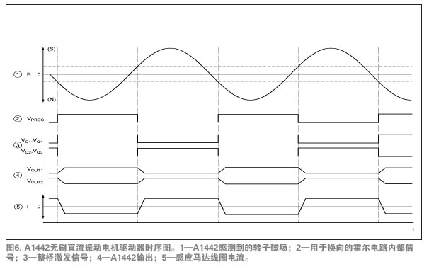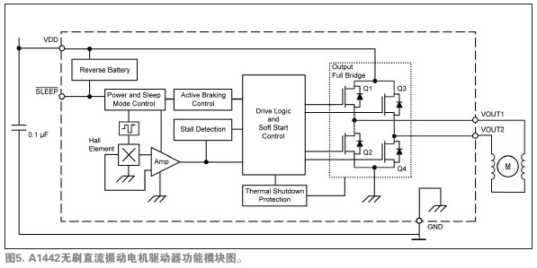 A1442是驅(qū)動馬達(dá)唯一必須的的IC。圖5所示的功能模塊圖說明了設(shè)備運行和先進(jìn)的特性。注意圖4和圖5中,采用集成的霍爾傳感器免除了外部霍爾傳感器,從而減少了馬達(dá)PCB元件數(shù)量。唯一所需的外部元件是一種標(biāo)準(zhǔn)電路特性——位于應(yīng)用馬達(dá)安裝PCB上的0.1µF的旁路電容,它用于降低在開關(guān)電源的電感負(fù)載時產(chǎn)生的瞬時電壓峰值。