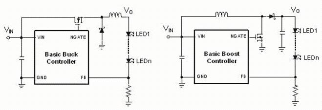 由于Boost和Buck-boost調節器的高度復雜性及其外圍電路、低效(特別是Buck-boost)和控制拓撲的選擇不足,致使它們都不是轉換LED驅動的首選。但是它們都是LED越來越多的照明應用必不可少的。某些系統結構可以用buck或者甚至是線性以調節器為基礎的LED驅動來替代。比如類似于街燈的大型光源需要一百甚至更多的1W+LED。一般來說,針對通用照明的LED從低功耗走向高功耗,并且在其中間舞臺,比如汽車前燈和小型光部件,boost和buck-boost調節器代表了常電流驅動的最佳選擇。