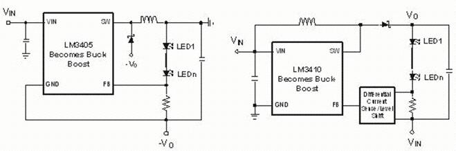 單電感Buck-boost可以像Buck或Boost調節器一樣組建,使它在系統成本的角度來講很吸引人。這種拓撲的一個缺點是Vo被反置(圖2a)或者以VIN為參照(圖2b)。測平移動或者反偏電路必須要用一些轉換器。像boost轉換器,它們有一個不連續輸出電流,并且需要一個輸出電容來維持一個持續LED電流。功率MOSFET要承受一個峰值為IIN加上IF的電流還有一個峰值為VIN加上VO的電壓。