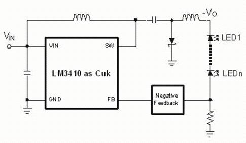 很少被用作電壓調節的Cuk轉換器作為LED驅動而嶄露頭角。輸入和輸出電流都是連續的。輸出電壓的極性就像高端buck-boost一樣被反置,但是輸出電容像buck轉換器一樣被消除。除Buck-boost和boost以外,Cuk是擁有這種能力的唯一的實用型非隔離調節器。