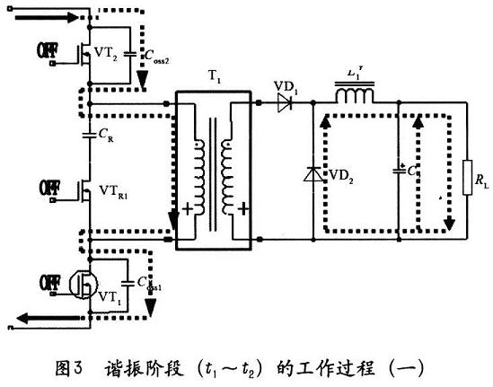 2)諧振階段(t1~t2),如圖3所示,在占空比的控制下,第一主開關(guān)管VT1和第二主開關(guān)管VT2在t1時刻同時關(guān)斷,變壓器磁芯極性反轉(zhuǎn)。因輸入電源和變壓器的勵磁電感的作用給VT1和VT2的寄生電容COSS1,COSS2充電,由于電容電壓不能突變,第一主開關(guān)管VT1和第二主開關(guān)管VT2在ZVS狀態(tài)下關(guān)斷。同時變壓器的勵磁電流開始給鉗位開關(guān)管VTR1的寄生電容COSS放電,經(jīng)VTR1的體二極管給鉗位電容CR1充電。次級VD1截止,VD2導(dǎo)通,L1經(jīng)過VD2續(xù)流繼續(xù)給負(fù)載RL供電。