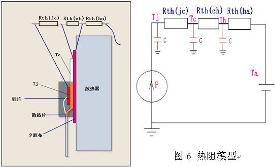 圖5為TO-220典型的安裝結構及熱模型。熱阻與電阻相似,所以我們可以將Rth(ja)看著幾個小的電阻串聯,從而有如下公式: