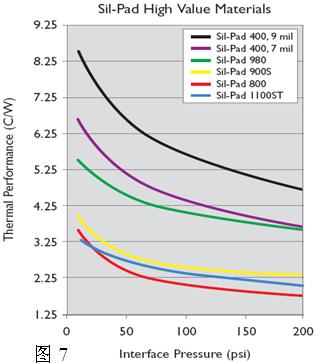 圖7為SilPad系列導熱材料對TO-220封裝的導熱性能隨壓力變化的曲線。