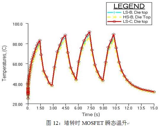 由圖10可知,堵轉時一直導通的下管最熱,溫度已接近150℃。由圖11可知,在堵轉100秒后MOSFET的溫升還未穩定,如果一直堵轉,必將燒壞MOSFET。因此,如果使用仿真中的散熱器尺寸,就不能一直堵轉,必須采取相應的保護措施。我們可以采用間隙保護的方法,即當電機堵轉時,堵轉一段時間,保護一段時間,讓MOSFET的溫度不超過最大結點溫度。圖12所示為堵轉1.5s,保護1.5s的瞬態溫升示意圖,由圖可知,采用這種方法可以有效地保護MOSFET。