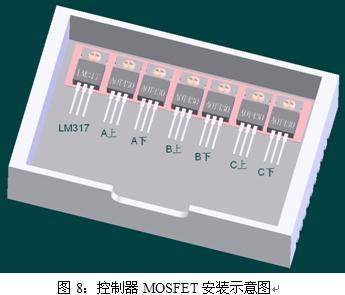 仿真條件:Ptotal=56.85W、Ta=45℃、控制器散熱器尺寸:70mm×110mm×30mm 、自然風冷,MOSFET安裝如圖8所示。