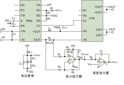 上述電路由電壓參考、分流電阻、差分放大器和誤差放大器組成。低端檢測電路是在PRM輸出端用配置為差分放大器的一個運放實現(xiàn)的。分流電阻(R1)上的電壓經(jīng)檢測并被放大電阻R2到R5確定的增益倍數(shù)。參考電壓使用精確可調(diào)的分流參考產(chǎn)生,并連接到誤差放大器的同相端子。這是誤差放大器用以與差分放大器輸出(VSENSE)比較的電壓。誤差放大器的輸出(VEAO)經(jīng)過電阻R7和R8連接到SC,從而實現(xiàn)PRM輸出設置點的調(diào)整。誤差放大器將調(diào)整PRM輸出電壓,直到VSENSE等于參考電壓VREF。這將迫使VTM輸入電流以及VTM輸出電流成為由VREF確定的常數(shù)。