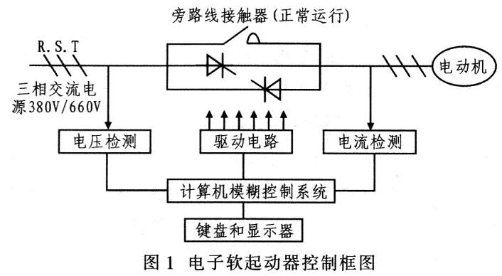 軟起動(dòng)有磁控降壓軟起動(dòng)器和電子軟起動(dòng)器。其中,磁控降壓軟起動(dòng)采用控磁限幅調(diào)壓方式減壓調(diào)控電動(dòng)機(jī)起動(dòng)時(shí)的電壓,實(shí)質(zhì)就是電抗器降壓起動(dòng)。電子軟起動(dòng)器有晶閘管調(diào)壓軟起動(dòng)和變頻器調(diào)速軟起動(dòng)。晶閘管調(diào)壓軟起動(dòng)器的主回路采用6只晶閘管兩兩反向并聯(lián)組成的調(diào)壓電路,并焊接于電動(dòng)機(jī)的三相供電線路。當(dāng)起動(dòng)器的微機(jī)控制系統(tǒng)接收到起動(dòng)指令后進(jìn)行有關(guān)計(jì)算。輸出晶閘管的觸發(fā)信號(hào),通過(guò)控制晶閘管的導(dǎo)通角起動(dòng)器按所設(shè)定的模式調(diào)節(jié)輸出電壓,從而控制電動(dòng)機(jī)的起動(dòng)。當(dāng)電動(dòng)機(jī)起動(dòng)完成后,起動(dòng)器吸合旁路線接觸器,使晶閘管短路,電動(dòng)機(jī)直接投入電網(wǎng)運(yùn)行,避免不必要的電能損耗。圖1為電子軟起動(dòng)器控制框圖。