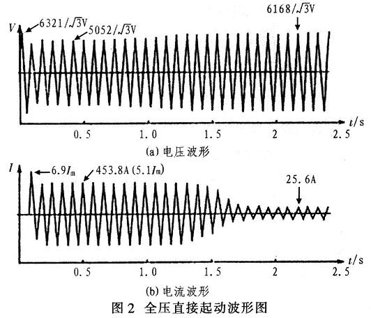 圖2為全壓直接起動(dòng)的電壓、電流波形。由圖2(a)電壓波形可見(jiàn),電動(dòng)機(jī)起動(dòng)前系統(tǒng)電壓為