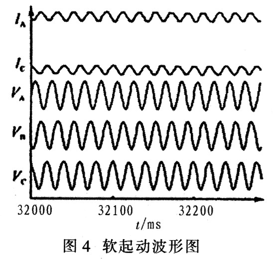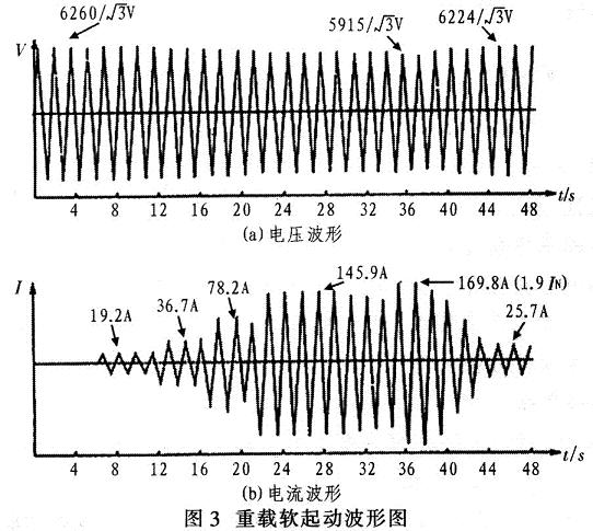 圖3為重載軟起動(dòng)的電壓、電流波形。從圖3(a)電壓波形可見(jiàn),電動(dòng)機(jī)起動(dòng)前系統(tǒng)電壓為